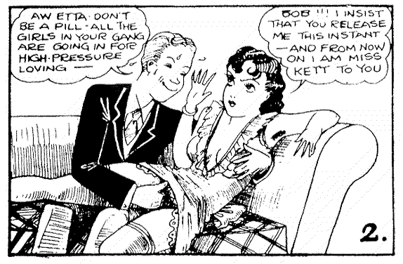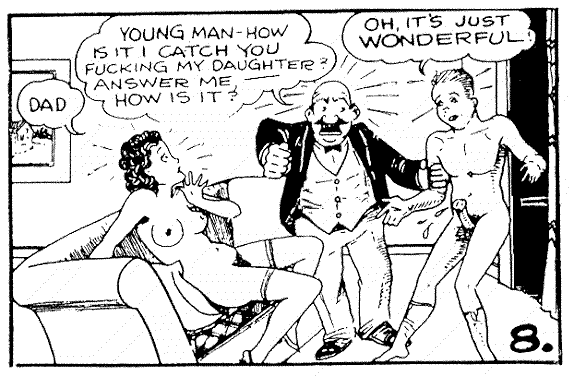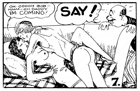 Etta gives in to temptation, on the family couch, but is discovered by her father, in this Tijuana Bible by Mr. Prolific. |
